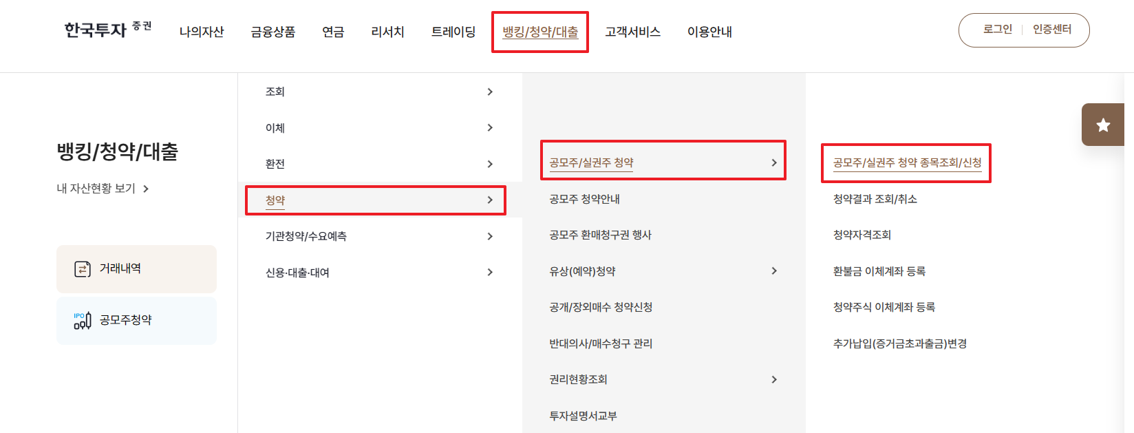 2. 뱅킹/청약/대출 - 청약 - 공모주/실전주 청약 - 공모주/실권주 청약 종목조회 /신청