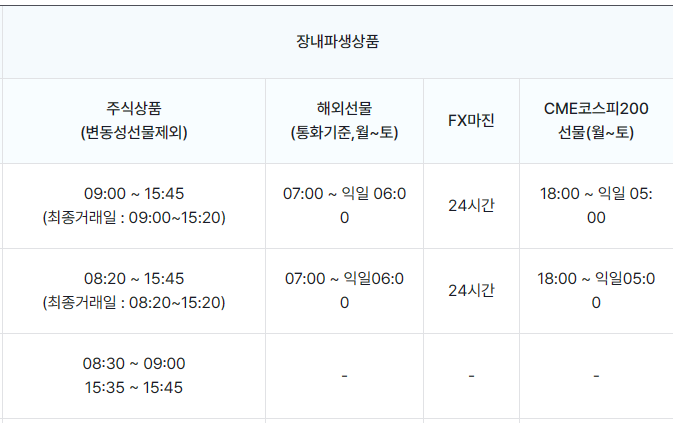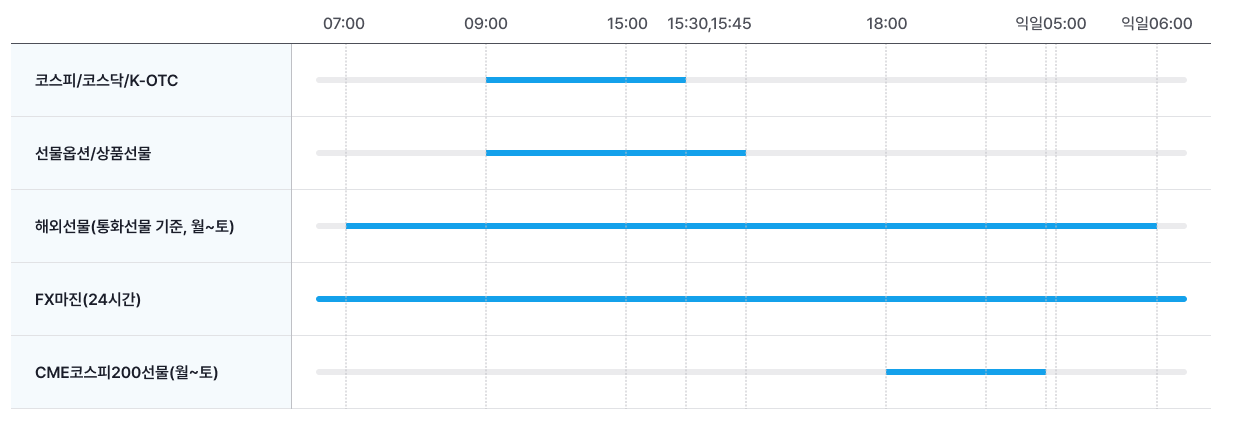 해외선물 (통화선물 기준, 월 ~토) : 09:00 ~ 15:45