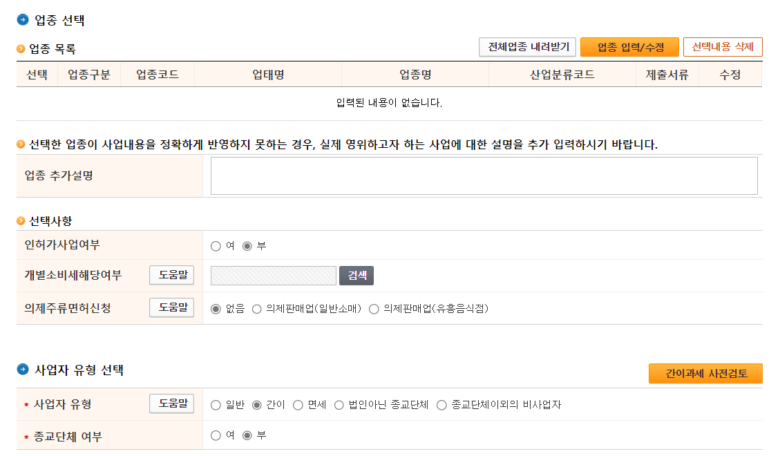 사전에 내가 어떠한 업종 할지 알아두는 게 좋으며 설명은 간단하게 작성하시면 됩니다.