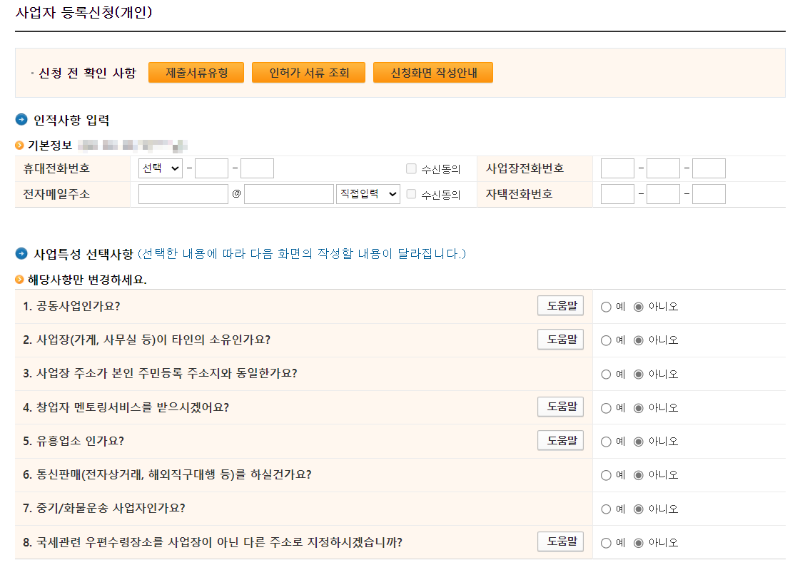 인적사항 입력란의 기본정보 입력 / 사업특성 선택사항 체크