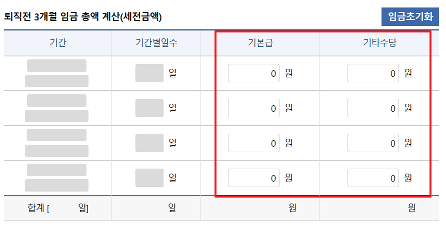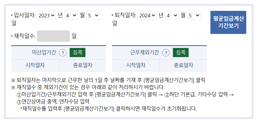 자동으로 재직일수와 퇴직 전 3개월의 기간별 일수가 뜹니다.
