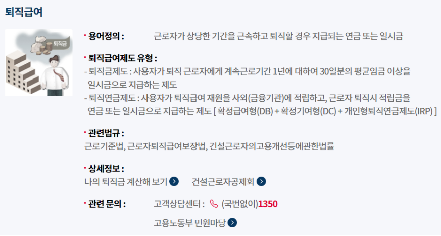 근로자가 회사에서 일한 기간 동안 적립된 금액으로 퇴직하거나 은퇴할 때 지급 되는 금전 혜택의 의미로 고용주가 계속된 근무기간 1년 동안 30일분 이상의 평균임금을 지불해야 하는 것을 의미합니다.