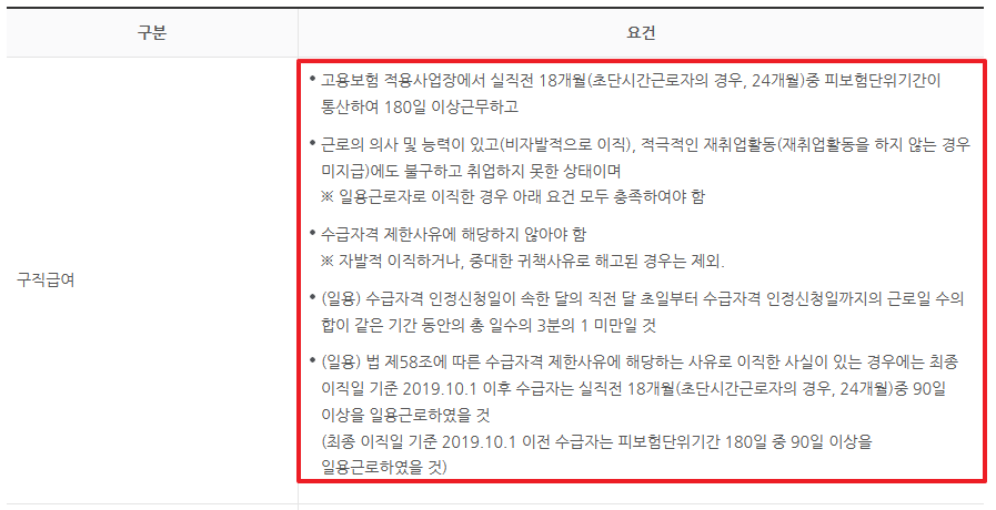 2. 기여기간 요건 : 퇴직 전 18~24개월 동안 고용보험에 가입하여 일한 것