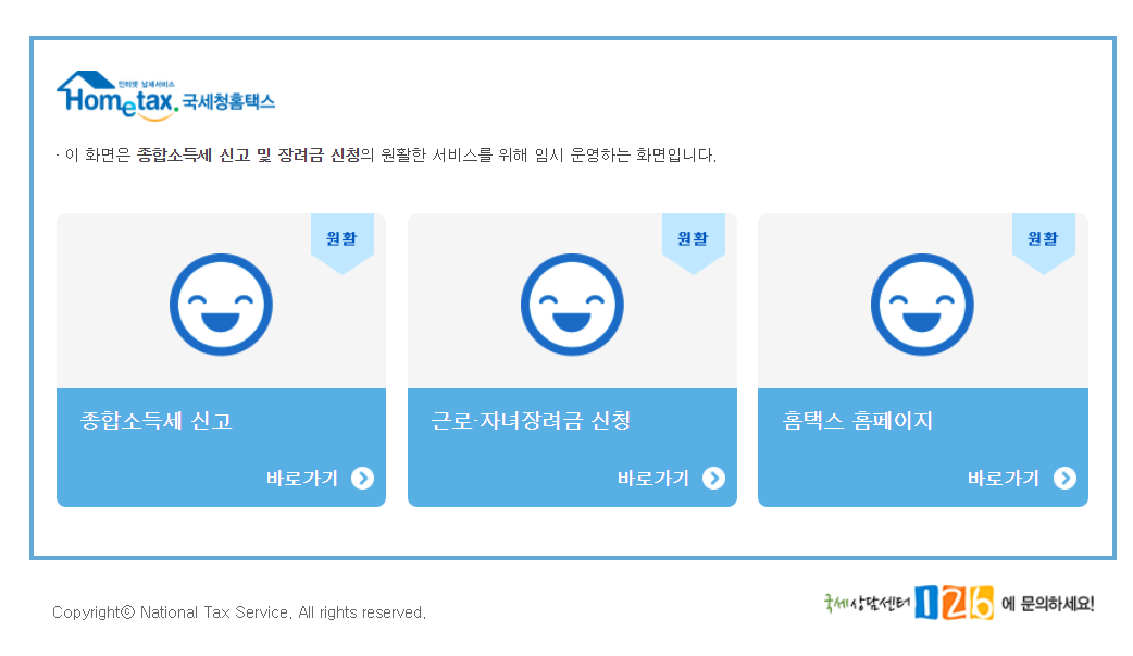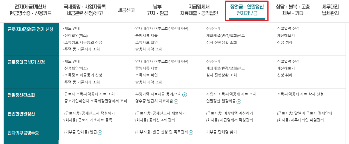 | 장려금.연말정산.전자기부금 | 근로.자녀장려금 신청, 연말 정산 간소화 자료 제공 공의신청, 연말정산 간소화 조회 등 |