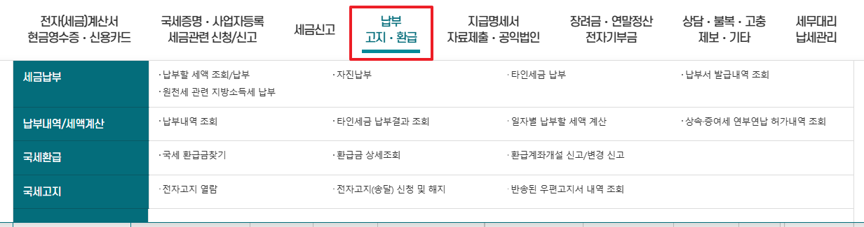 | 납부.고지.환급 | 국세 납부 및 내역조회. 고지확인, 환급금 조회 등 |
