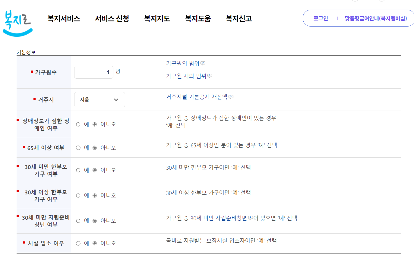 소득과 재산, 가구수에 따라 자격이 달라질 수 있습니다. 간단한 항복들을 입력하여 모의계산을 하여 내가 수급할 수 있는지 여부를 미리 해보는 것도 좋습니다.