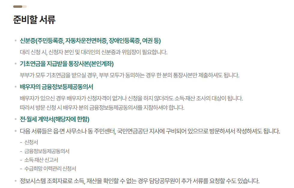 기초연금 신청을 위해 준비해야 할 서류는 크게 신분증명서와 소득 및 재산 관련 서류입니다. 구체적으로는 다음과 같습니다.