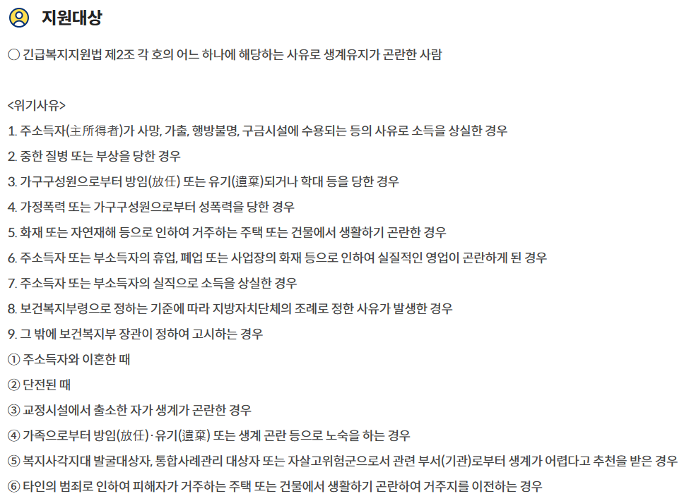 긴급 복지 생계 지원대상은 안내해 둔 위기 사유 중 어느 하나에 해당하는 사유로 생계유지가 곤란한 사람이 대상입니다.