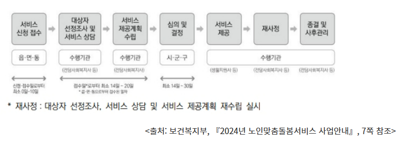 서비스 신청(신청자) : 노인맞춤 돌봄 서비스를 필요로 하는 노인 또는 그 가족 등이 읍. 면. 동 주민센터방문 등을 통해 신청