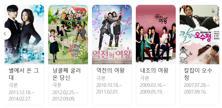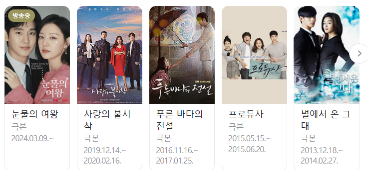 사랑의 불시착, 푸른 바다의 전설, 프로듀사, 별에서 온 그대, 넝쿨째 굴러온 당신, 역전의 여왕, 내조의 여왕, 칼잡이오수정