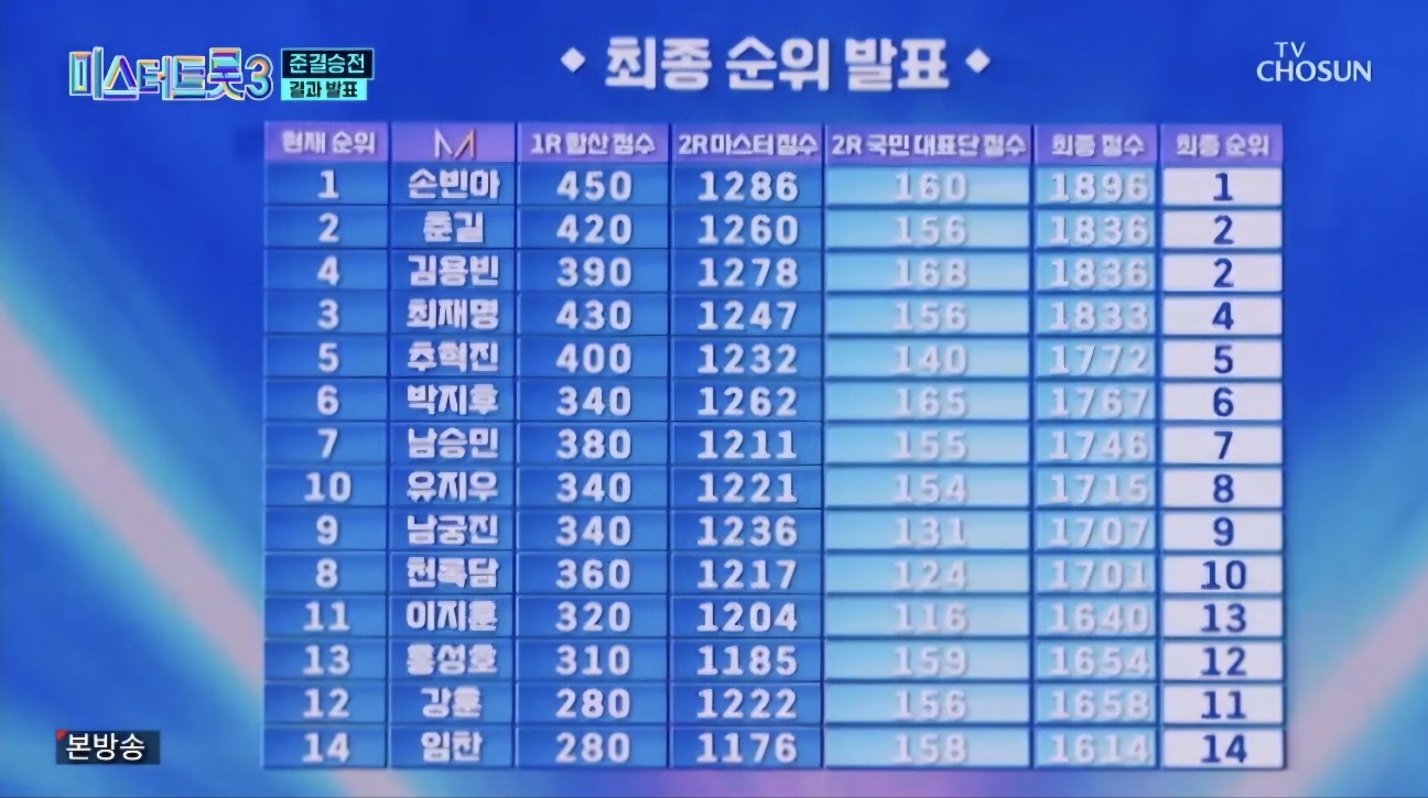 치열한 준결승전을 거쳐 선정된 TOP10의 최종 순위는 다음과 같습니다.