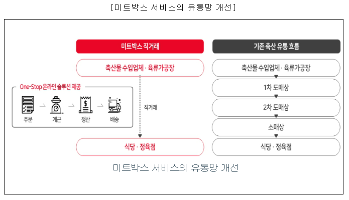 미트박스글로벌은 축산물 직거래 플랫폼인 미트박스를 운영하고 있습니다. 미트박스 서비사는 기존 축산물 유통 시장의 복잡한 구조와 정보의 비대칭성 문제를 해결하고자 2014년에 출시되었습니다. IT기술을 활용한 온라인 직거래 플랫폼으로 유통 단계를 단순화하고 가격정보의 투명성을 제고하였습니다.