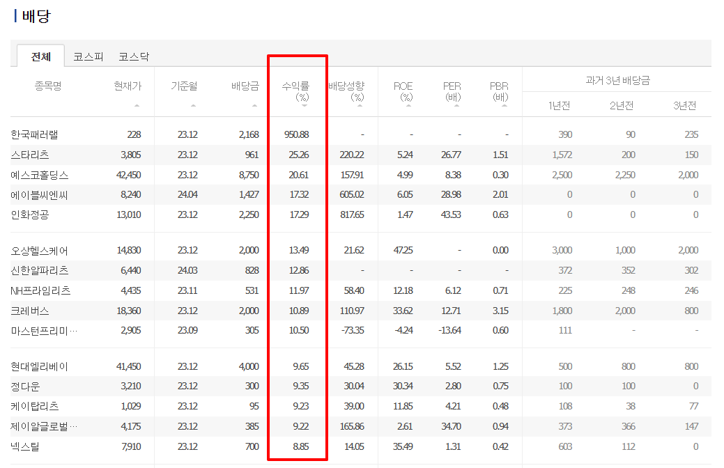 | 종목 | 현재가 | 기준월 | 배당금 | 수익률 | 1년전 | 2년전 | 3년전 |