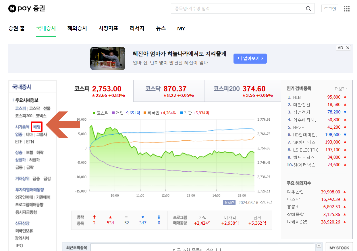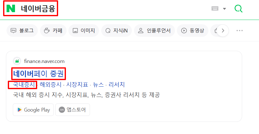 네이버페이 증권 - 국내증시를 클릭합니다.