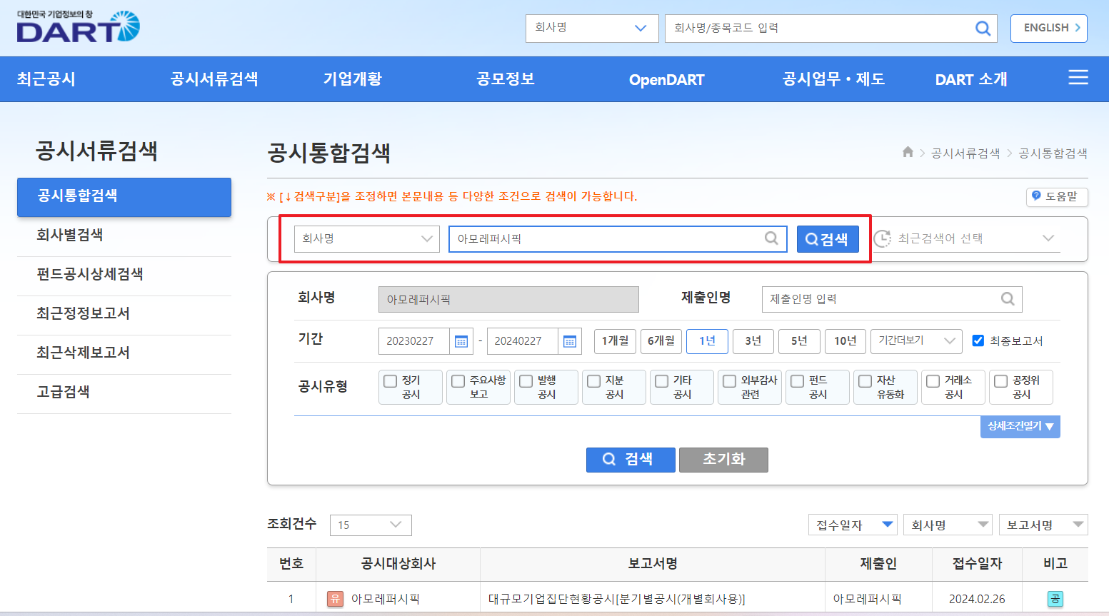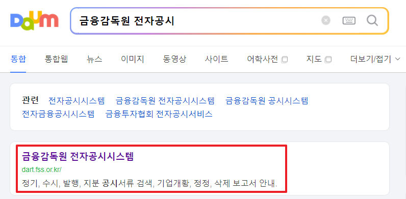 공시통합검색 창에 검색하려고 하는 기업명을 검색
