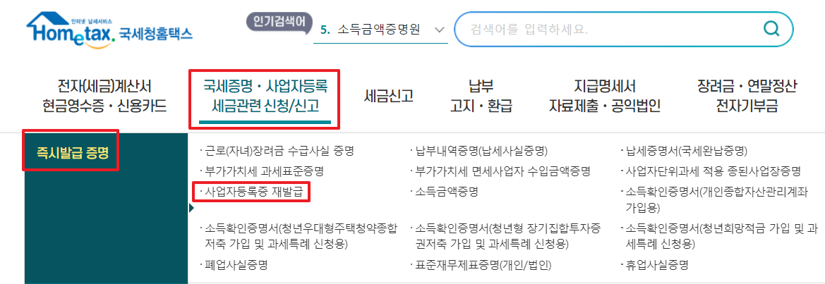 즉시 발급 증명 - "사업자 등록증명 " 또는 " 사업자 등록증 재발급 클릭"