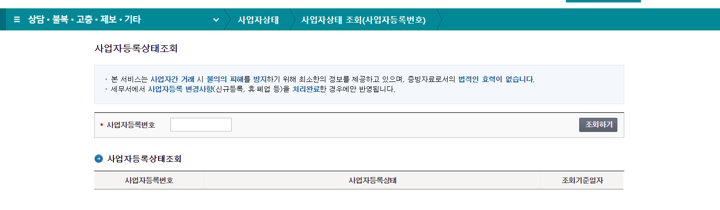 상담.불복.고충.제보,기타 에서 사업자상태 -사업자상태조회(사업자등록번호)