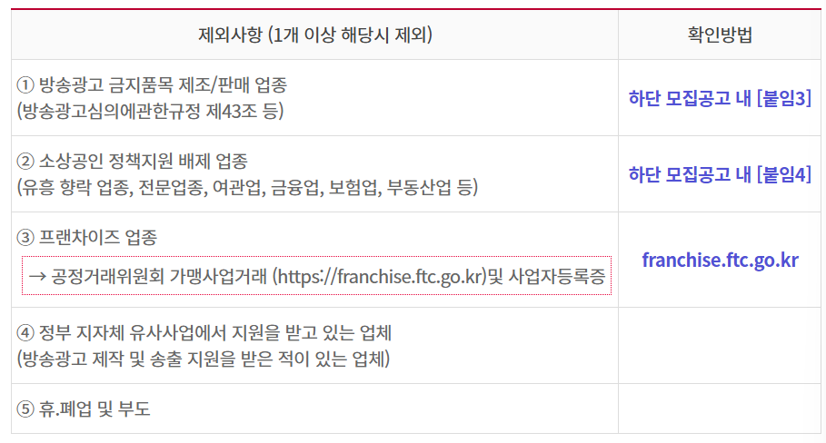 - 소상공인 정책지원 배제 업종 (유흥향락업종, 전문업종, 여관업, 금융업 등)