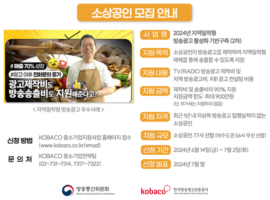 지원대상으로 선정된 소상공인은 방송광고 제작 및 송출 비용의 90% 범위 내에서 최대 900만 원까지 지원받을 수 있습니다. 지원대상을 알아보고 신청하는 방법을 알아보도록 하겠습니다.