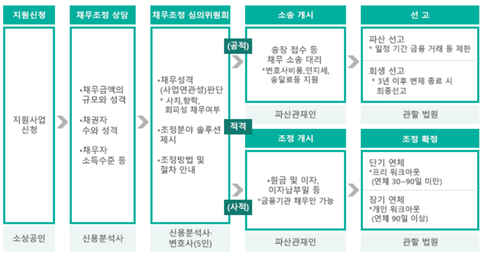 지원신청 - 채무조정상담 - 채무조정심의 위원회 - 소송개시(조정개시) - 신고