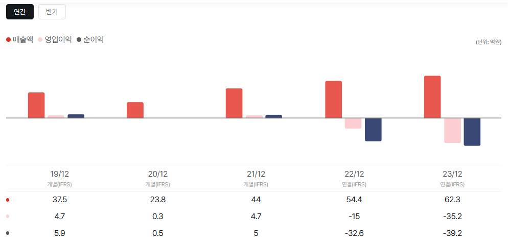 2023년 매출액 62.3억, 영업이익 -35.2억, 순이익 -39.2억