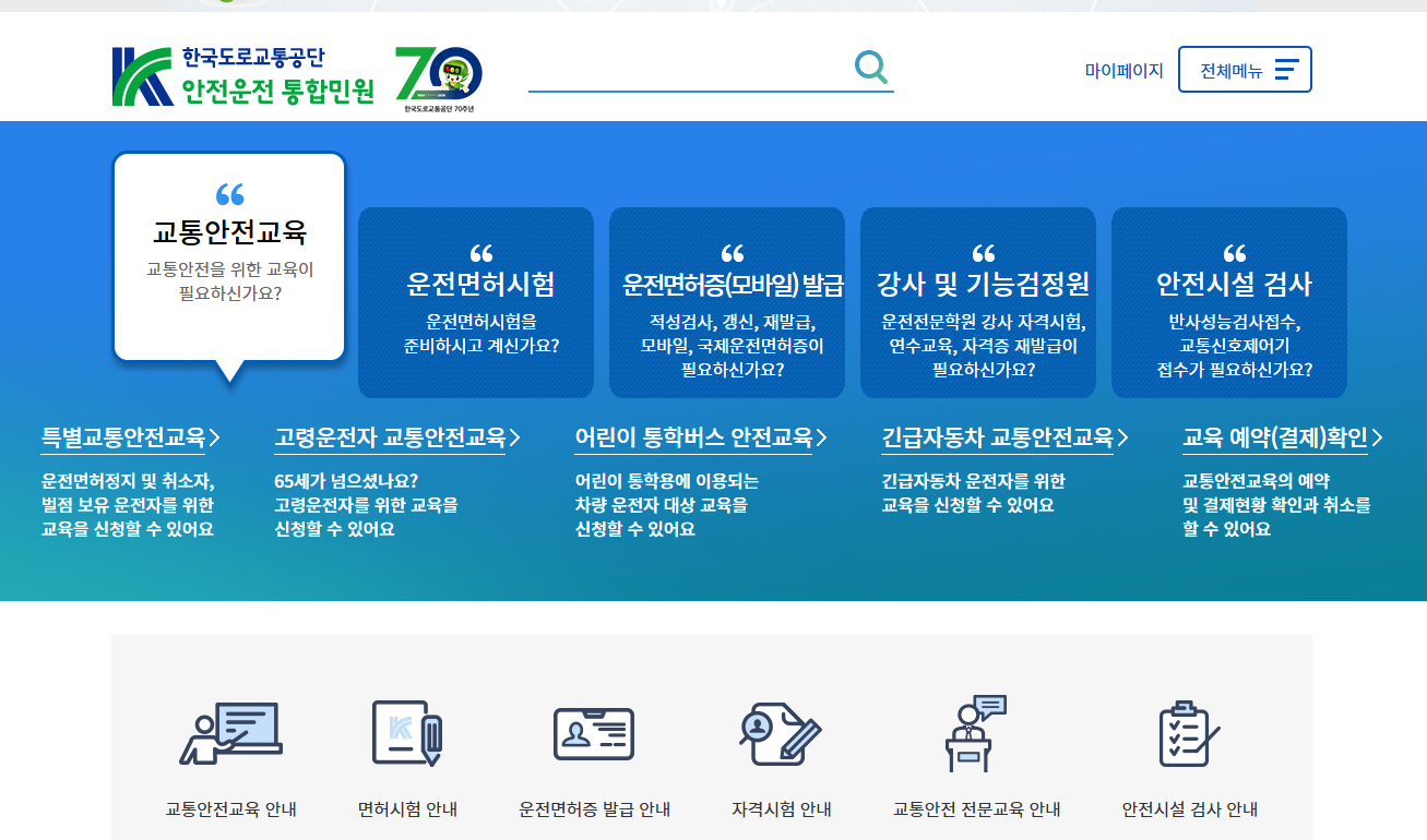 적성검사 안내 및 신청: 갱신 시 필요한 적성검사에 대한 안내와 예약을 온라인으로 할 수 있습니다. 적성검사는 일정 주기마다 의무적으로 받아야 하므로, 관련 정보를 미리 확인할 수 있습니다.