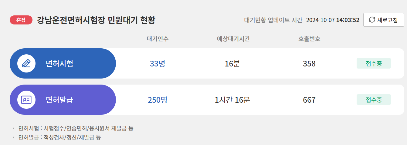 실시간으로 민원대기 면허시험, 면허 발급 현황을 확인하실 수 있습니다.