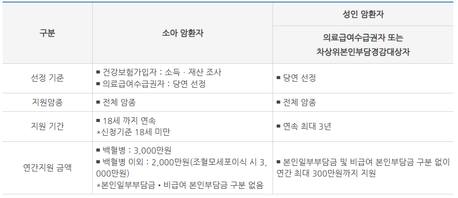 대상 : 의료 수급자, 18세 미만의 암 환자로 소득 및 자산 검사 후 기준 미달자