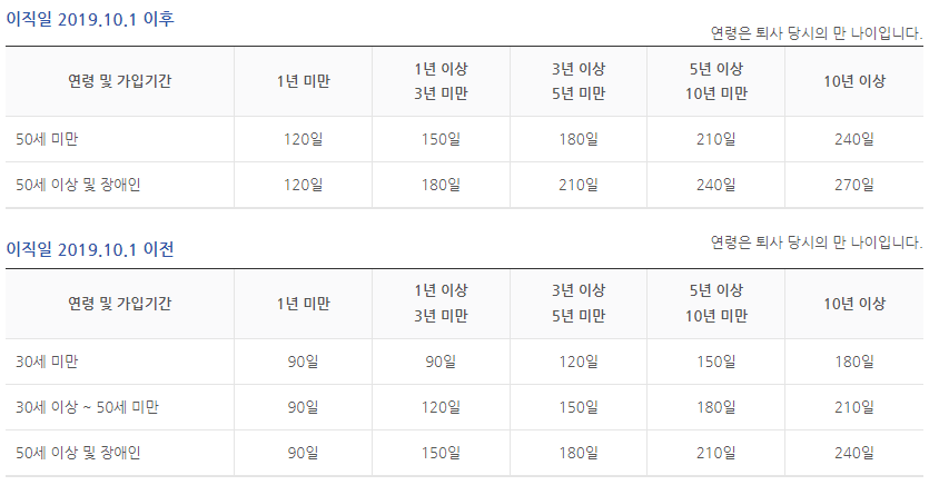 (이직일 2019년 10월 1일 이전은 90일~240일 범위 내에서 퇴직 전 평균 임금의 50%)