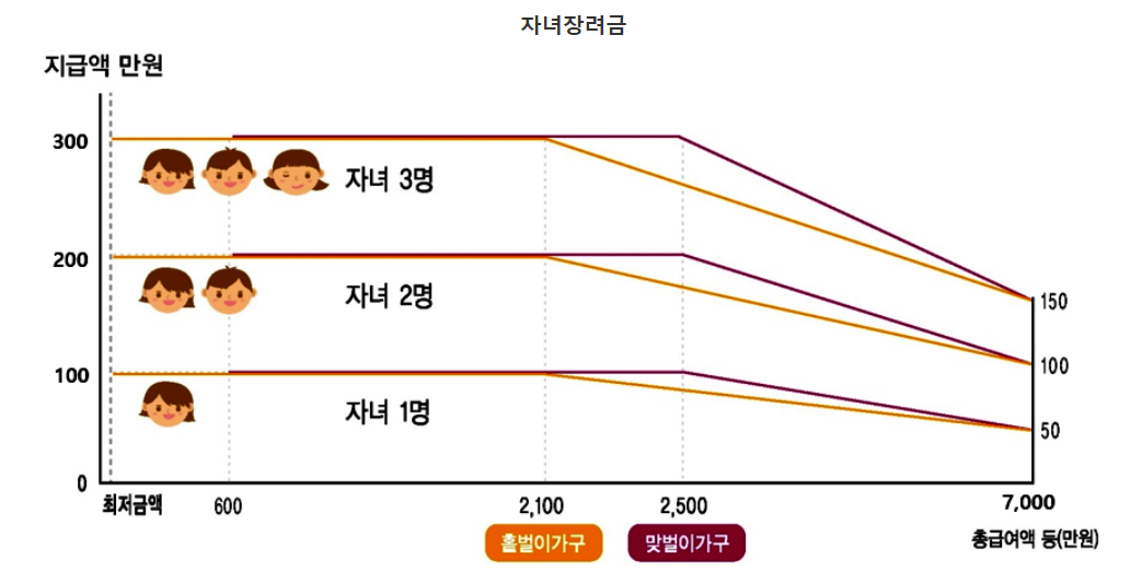 자녀 수에 따라 지급액이 증가하며, 동일한 기준이 적용됩니다.
