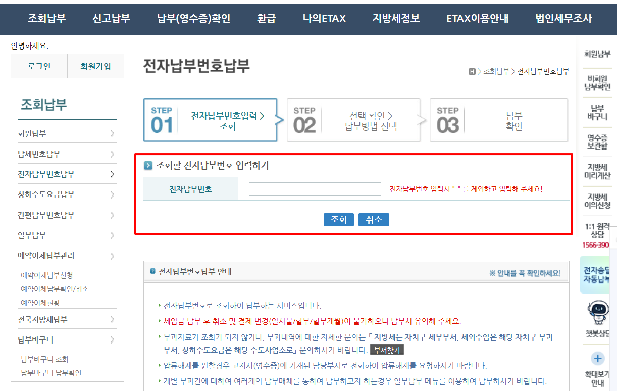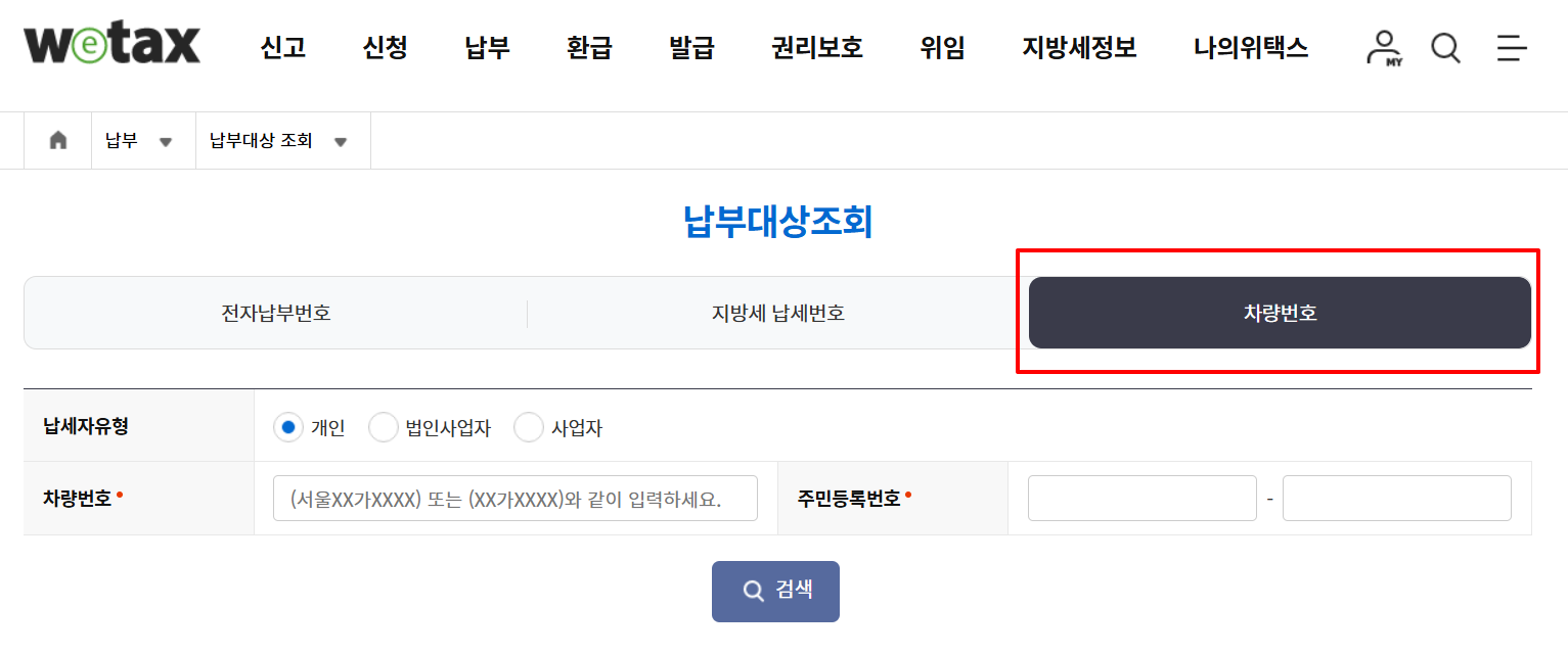 전자납부번호, 지방세 납세 번호, 차량 번호로 조회 가능합니다.