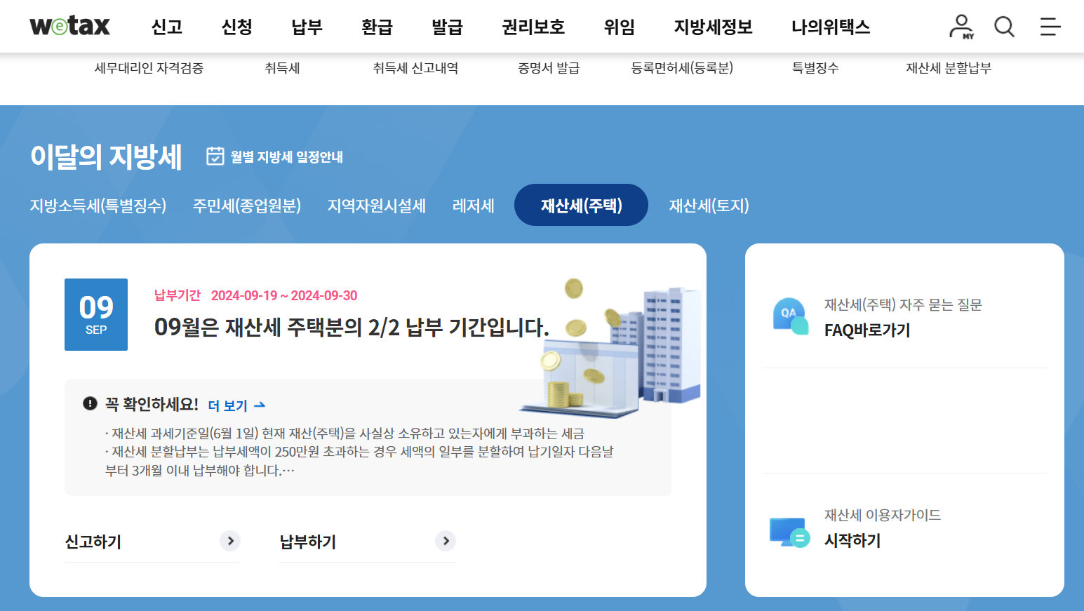 위택스는 지방세를 온라인으로 납부할 수 있는 사이트입니다. 재산세를 포함한 모든 지방세를 조회하고 납부할 수 있습니다.