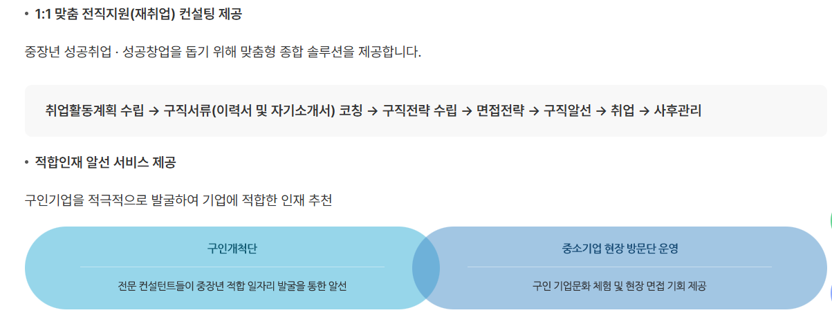 중장년 내일센터는 사용자의 취업 요구를 지원하기 위해 광범위한 서비스를 제공합니다. 여기에는 다음이 포함됩니다.