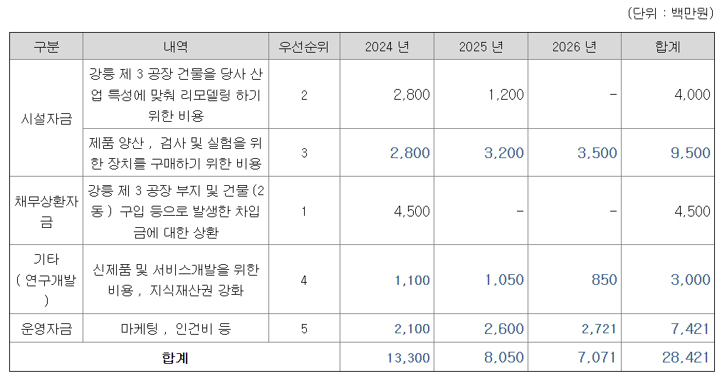 시설자금, 채무상환자금, 연구 개발 자금, 운영자금으로 사용될 계획입니다.