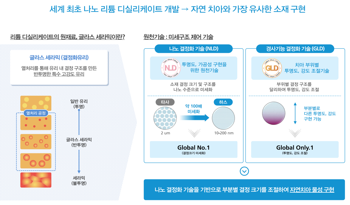 경사기능결정화 기술 : 치아 경사에 따라 부분별로 다르게 강도와 투명도를 조절할 수 있게 만들어 주는 기술입니다.