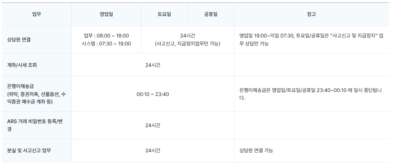 - 업무시간 안내 :주식, 금융상품거래, 입출금 , 청약 및 기타 업무 시간