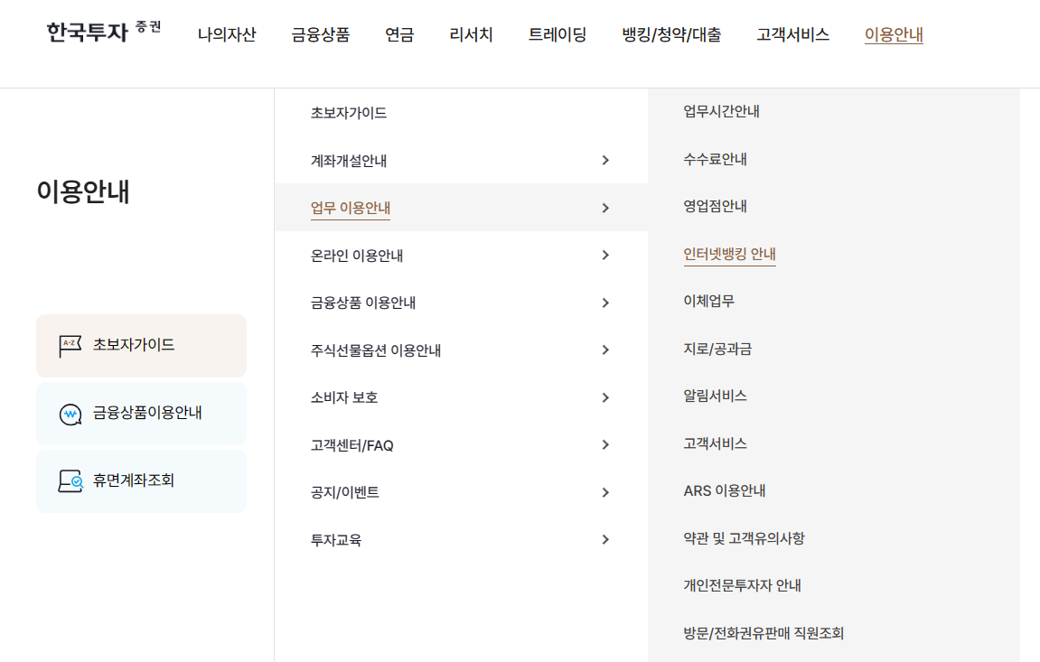 - 이체업무 :입출금 안내, 주식/채권 이체 안내 , 자동이체 서비스, 이체예약 서비스