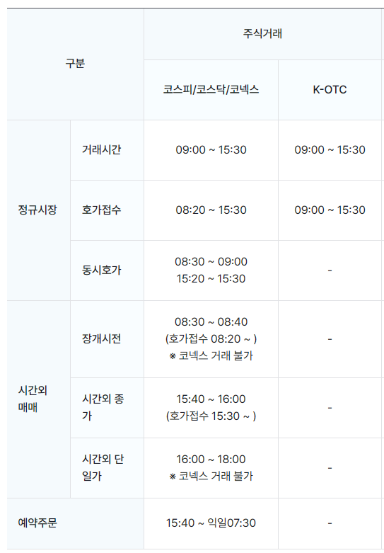주식 거래 시간 : 09 :00 ~ 15:30 (코스피, 코스닥, K-OTC)