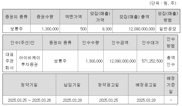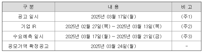 공모 청약 일정은 3월 25일~26일 일반 청약이 진행되며, 3월 28일 주식 배정 및 납입이 완료될 예정입니다.