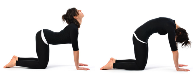 팔목과 어깨가 일직선상에 , 무릎과 엉덩이가 일직선상에 놓인 상태로 손바닥과 무릎을 대고 엎드린 자세에서 시작합니다.