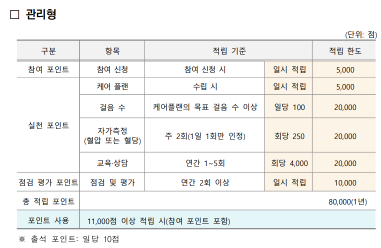 국민의 건강상태를 스스로 알 수 있도록 정보를 드리고, 개인이 주도적으로 건강생활을 실천한고 개선되는 정도에 따라 포인트를 지급하는 사업입니다.