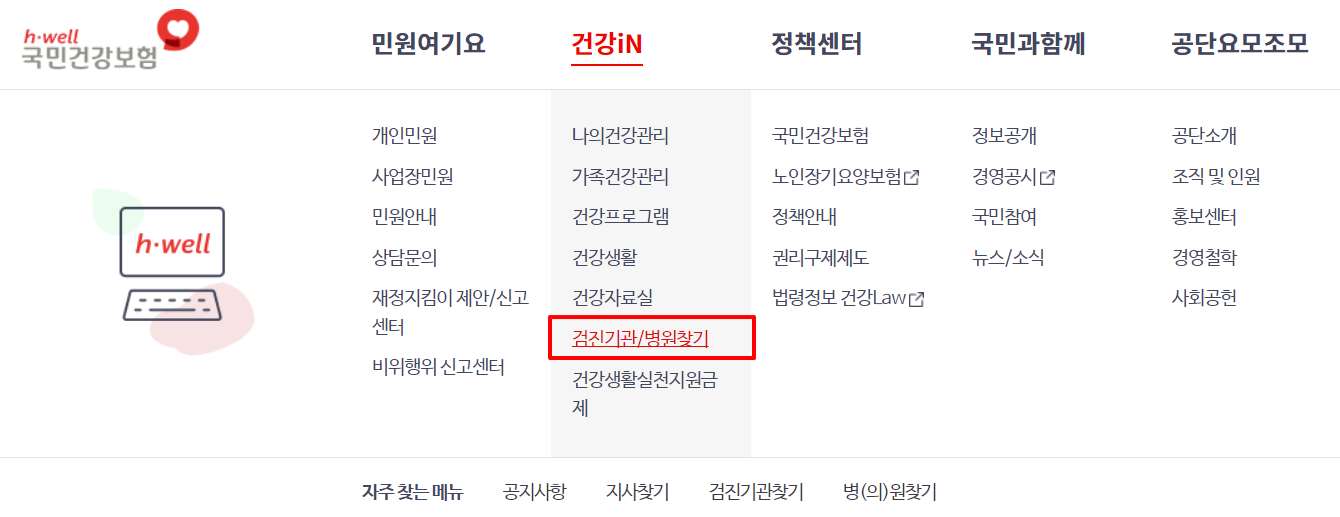 국민건강 보험에 접속 후 건강iN - 검진기관/병원찾기를 눌러주시면됩니다.