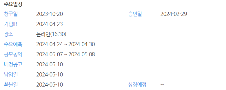 공모 청약일 : 2024년 5월 7일 ~ 5월 8일 |