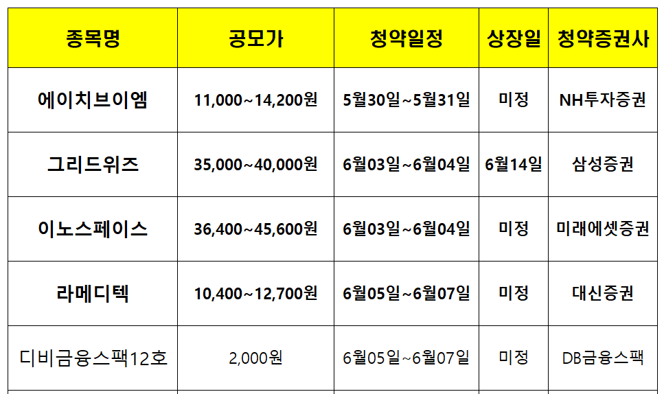 3. 이노스페이스 : 청약일정 : 6월3일 ~ 6월 4일 / 청약증권사 : 미래에셋증권