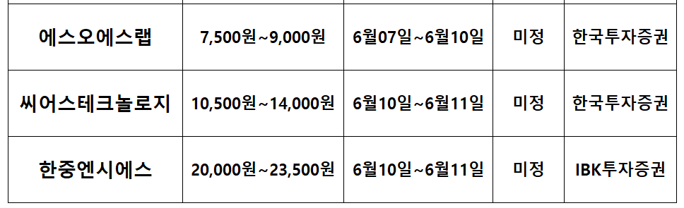 6. 씨어스테크놀로지 : 청약일정 : 6월 10일 ~ 6월 11일 / 청약증권사 :한국투자증권