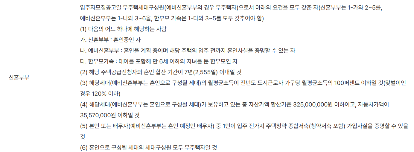 신혼부부 : 신청인 혼인 기간 7년 이내 또는 태아를 포함 한 6세 이하의 자녀를 둔 부부를 의미합니다.